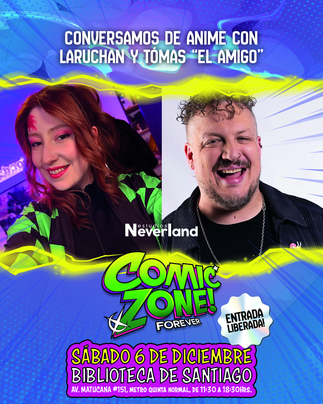 Una charla de anime a cargo de los rostros de Estudios Neverland, Tomás “El amigo” y la comunicadora Laruchan; el guionista de cómics Sebastián Castro (“Guardianes del Sur”, “Barrabases”) conversando sobre lo más potente de la gráfica este año; además de los cinéfilos Agustín “Hobby Space” Pérez, Javiera “Libromancias” Cerda y Alfredo “El Lama” Lamadrid Jr. debatiendo en torno a películas y libros 2025 serán los paneles que estarán en esta CÓMIC ZONE FOREVER.