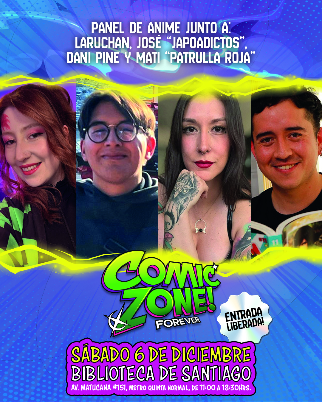 Una charla de anime a cargo de la comunicadora Laruchan, Matías “Patrulla Roja”, Dani Pine y José “Japoadictos”; el guionista de cómics Sebastián Castro (“Guardianes del Sur”, “Barrabases”) conversando sobre lo más potente de la gráfica este año; además de los cinéfilos Agustín “Hobby Space” Pérez, Javiera “Libromancias” Cerda y Alfredo “El Lama” Lamadrid Jr. debatiendo en torno a películas y libros 2025 serán los paneles que estarán en esta CÓMIC ZONE FOREVER.