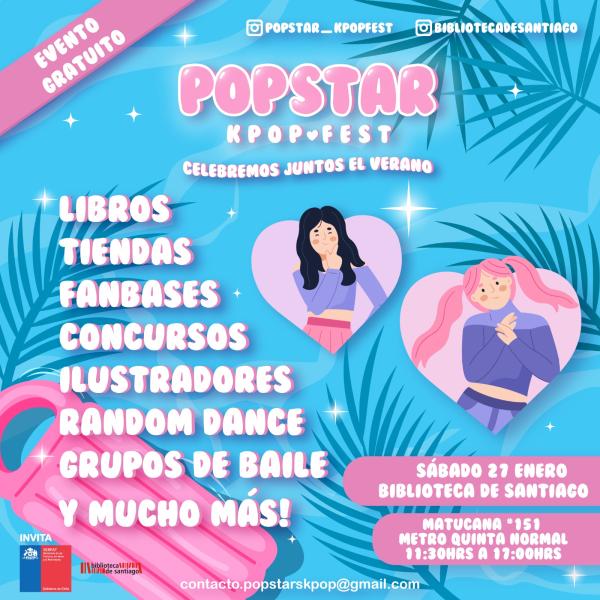 “Popstar: K-Pop Festival” edición Biblioteca de Santiago en Verano / Sábado 27 de enero de 11:30 a 17:00 hrs / Sala Exposición Zócalo y Auditorio / Entrada Liberada / Avda. Matucana 151 (metro Quinta Normal – estacionamientos gratuitos limitados por orden de llegada).